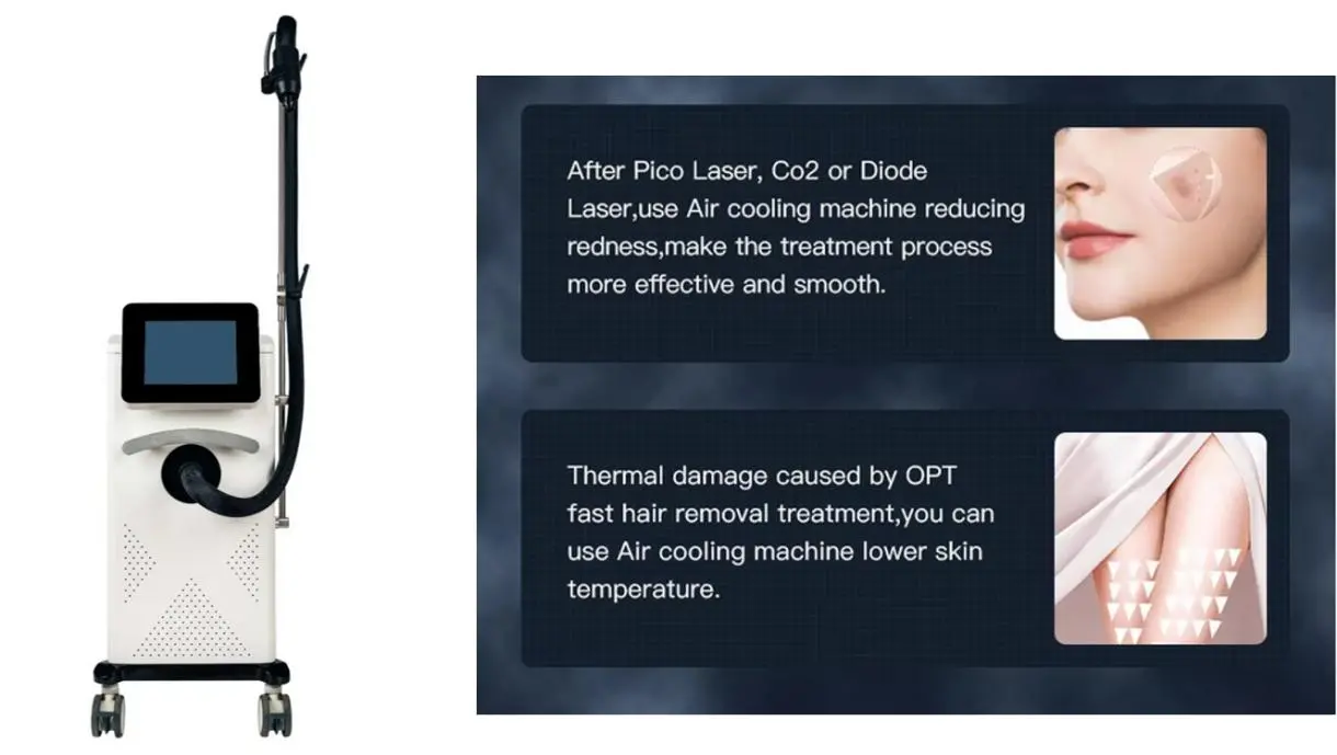 1) ให้อากาศเย็นอย่างต่อเนื่องเพื่อกำหนดเป้าหมายเนื้อเยื่อลดความเจ็บปวดและความเสียหายจากความร้อนในระหว่างการรักษาด้วยเลเซอร์และ IPL และให้การบรรเทาชั่วคราวสำหรับการฉีดเครื่องสำอาง
