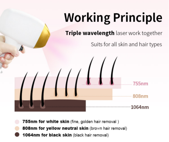 การกำจัดขนด้วยเลเซอร์แบบดั้งเดิมมักจะใช้เลเซอร์ความยาวคลื่นเดียว ความยาวคลื่นเลเซอร์ที่แตกต่างกันมีความสามารถในการดูดซับที่แตกต่างกันสำหรับความลึกของเส้นผมและเม็ดสีผิวดังนั้นเลเซอร์ความยาวคลื่นเดียวอาจไม่ได้ผลที่ดีที่สุดสำหรับเส้นผมและสภาพผิวทั้งหมดความยาวคลื่น 755Nm: ส่วนใหญ่ทำหน้าที่บนเส้นผมใกล้กับพื้นผิวของผิว